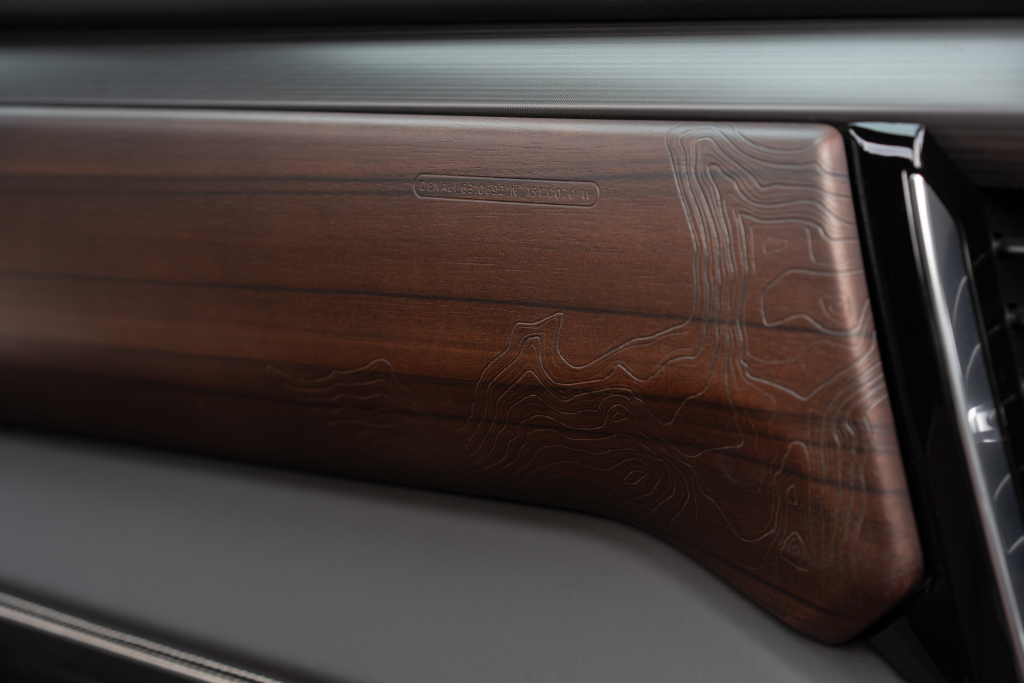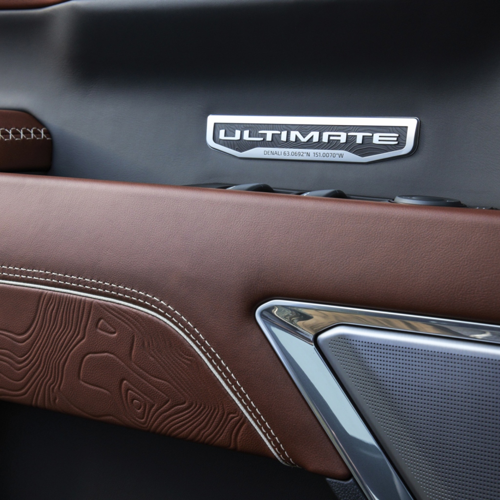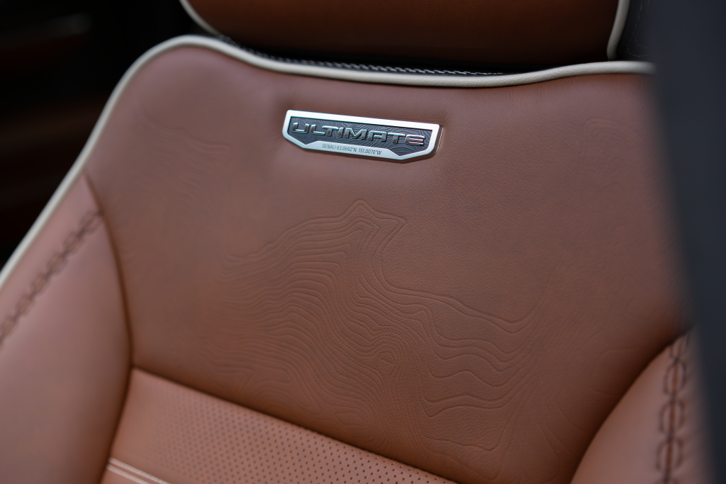 Real craftsmanship is everywhere. Authentic open-pore wood trim runs across the dashboard and doors, adding a premium texture you rarely see in trucks. Even more distinctive, GMC integrates topographical map patterns of Mount Denali etched into the wood and leather which is a nice artistic detail that reinforces the truck’s premium identity. The Denali Ultimate emblem on the seating also has the exact geographical coordinates of Mount Denali.