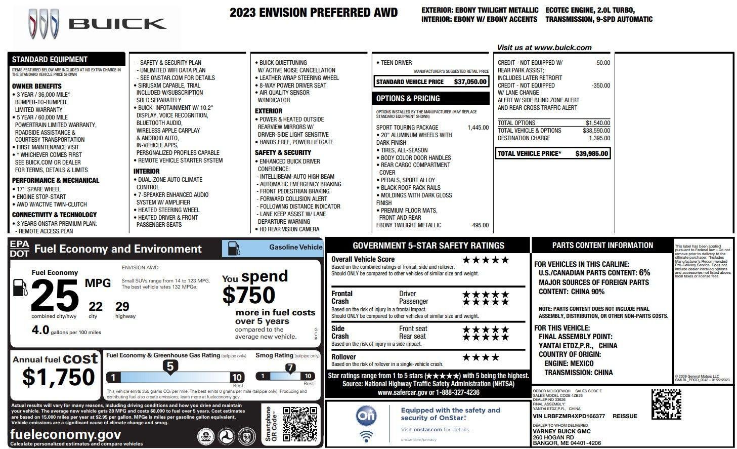 Look at these verified options: Auto High-beam Headlights, Automatic Emergency Braking, Following Distance Indicator, Forward Collision Alert, Front Bucket Seats, Front dual zone A/C, Front Pedestrian Braking, Heated front seats, Heated steering wheel, IntelliBeam Headlamp Control w/Auto High Beam, Lane Keep Assist w/Lane Departure Warning, Power Liftgate, Remote keyless entry, SiriusXM Radio, Buick Quiettuning, Split folding rear seat,.
